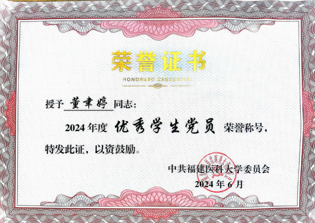 董聿婷,2020年9月17日加入中国共产党,公共卫生学院2023届预防医学专业本科毕业生,现为公共卫生学院2023级流行病与卫生统计学专业硕士研究生,于2024年6月获“亚洲中文精品乱码2024年度优秀学生党员”荣誉称号。