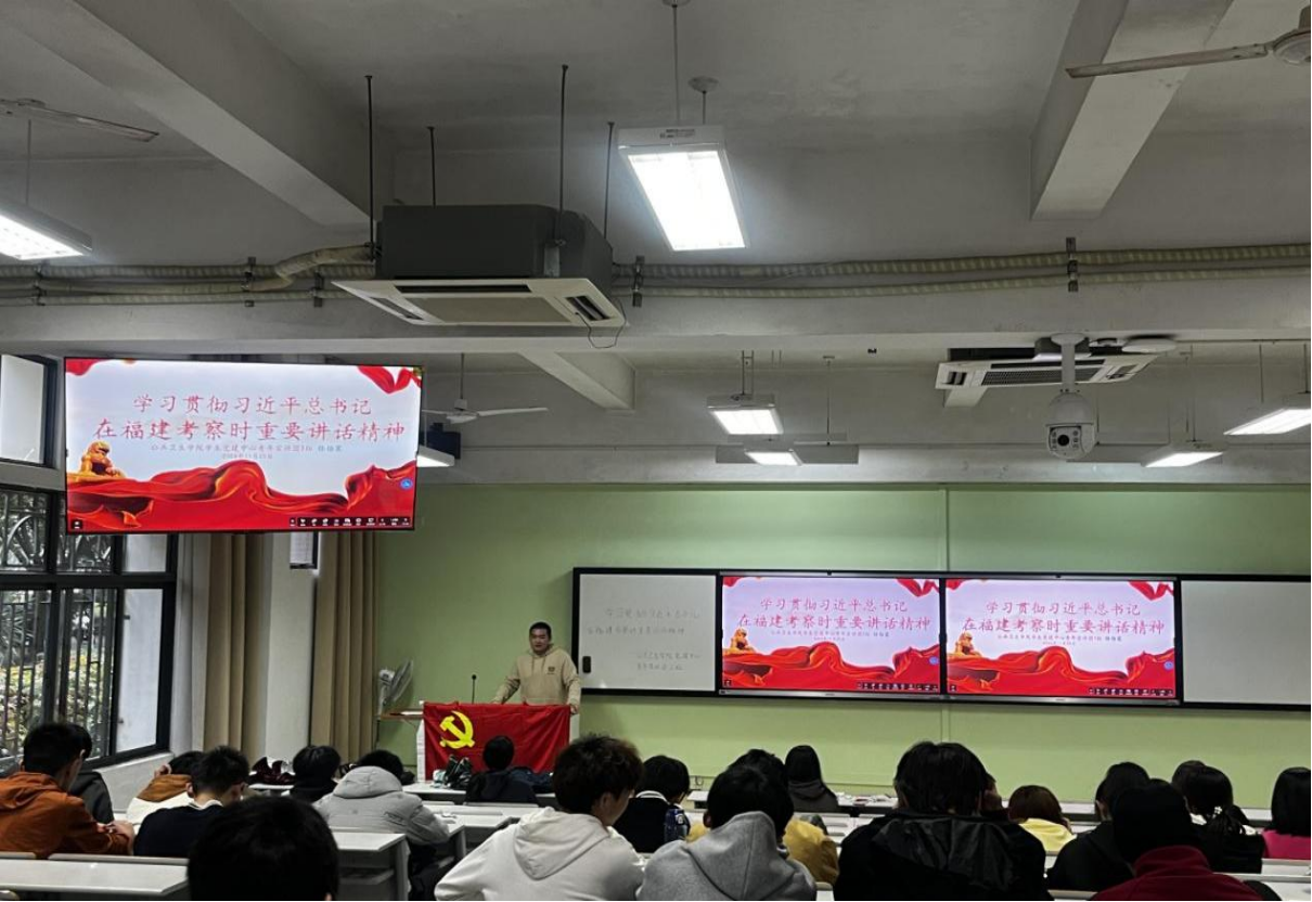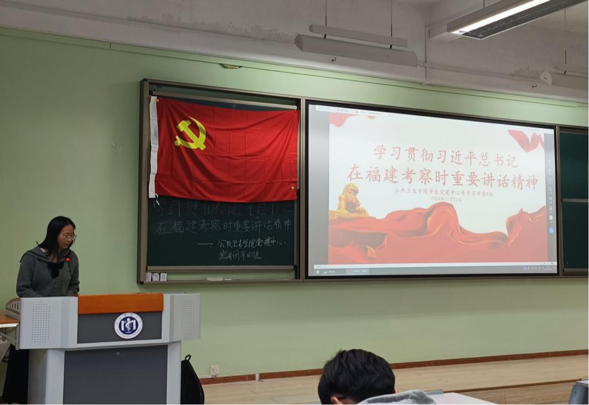 宣讲团二组于2024年11月26日在上街校区8教开展“学习贯彻习近平总书记在福建考察时重要讲话精神”宣讲活动,宣讲对象为2023级预防医学专业学生,共134人。二组主要讲述了习近平总书记考察谷文昌纪念馆的行程,带领同学们进一步了解谷文昌同志的感人事迹,强调党员干部要坚守初心,真正做到为人民服务。