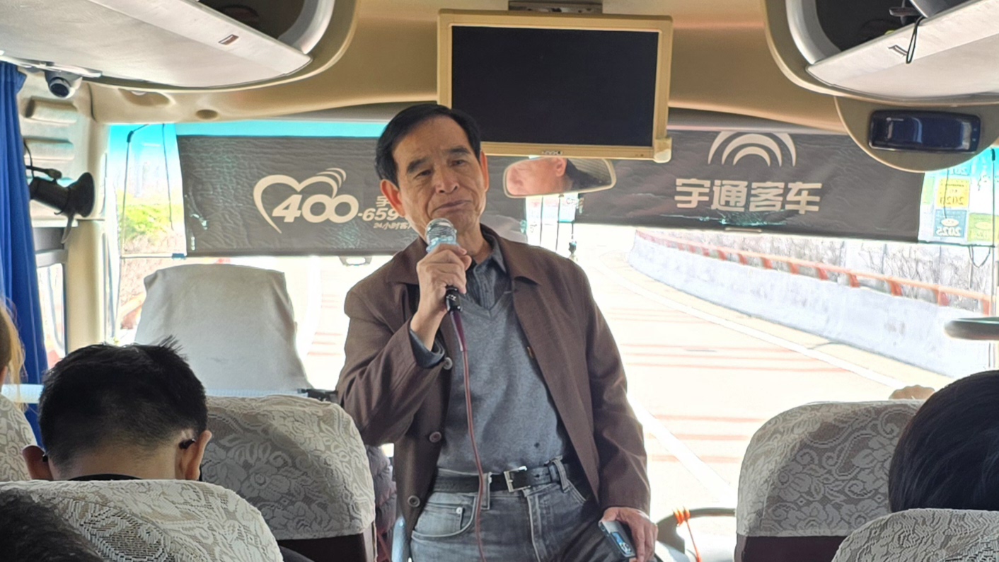 在开往烈士陵园的大巴车上,唐明生和李元芳两位老党员为同学们深情讲述了革命先辈为福建和福州的解放与建设事业浴血奋斗的英勇故事。